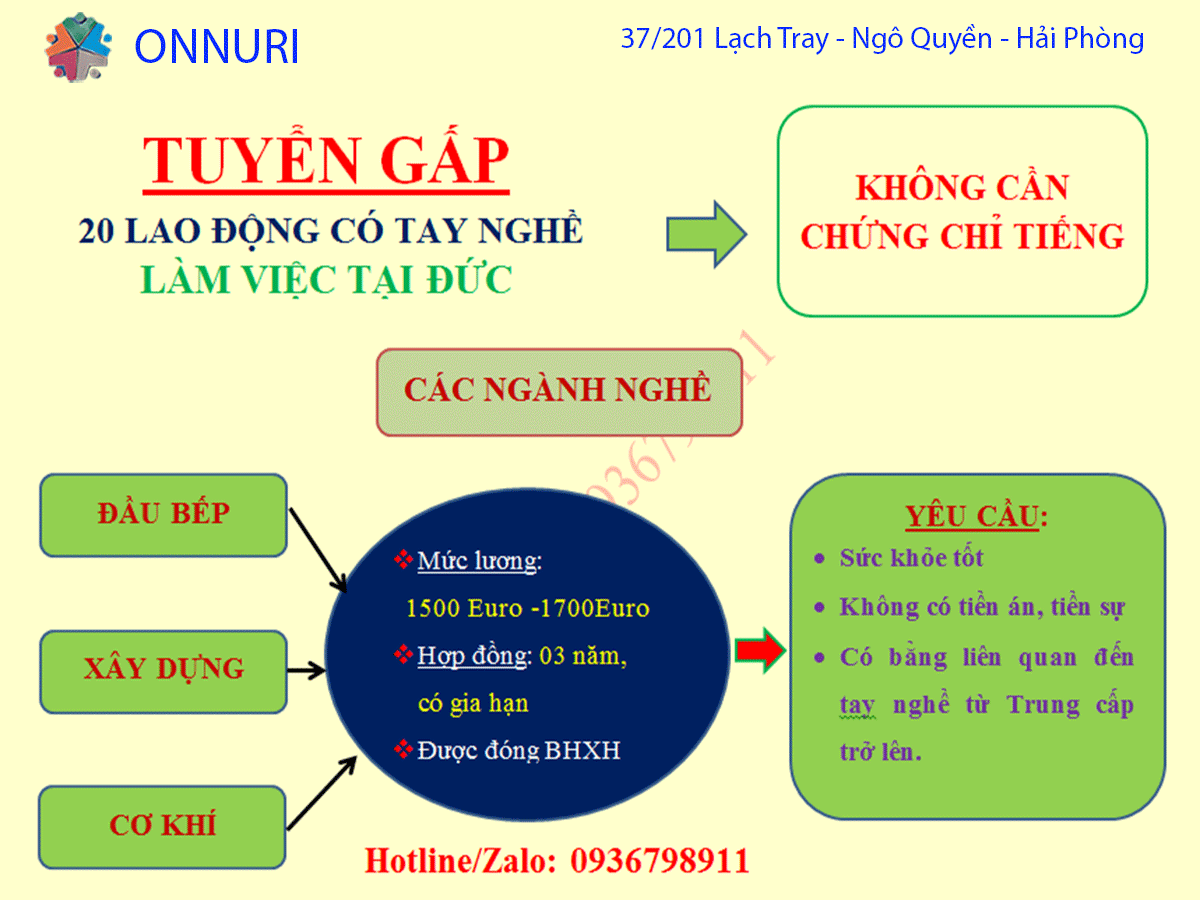 Công ty ONNURI cần tuyển gấp 20 lao động có tay nghề với các ngành nghề Đầu bếp, Cơ khí, Xây dựng…đi làm việc tại Đức ngay trong năm 2023 này